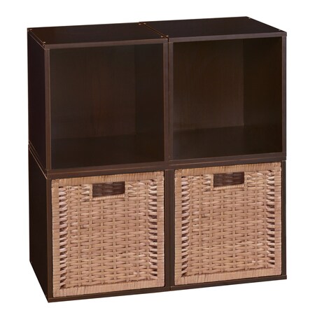 Niche Cubo Storage Organizer Open Bookshelf Set- 4 Cubes 2 Wicker Basket- Truffle/Natural