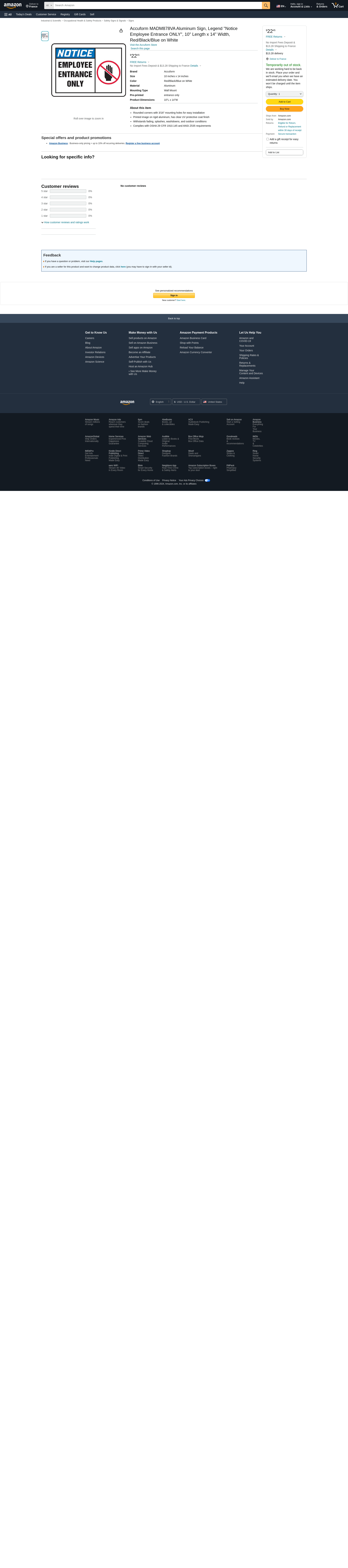 Accuform MADM878VA, 10" x 14" OSHA Notice Safety Sign "Employee Entrance Only" Aluminum Features: Stands up indoors and out Thin enough to conform to curved surfaces .032 inches thick for strength and flexibility Finished with four mounting holes