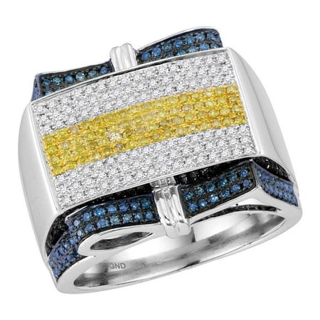 <p><span style="font-size:16px;"><b><u>Description</u></b><br /></span></p> <p><span style="font-size: 14px;">10kt White Gold Mens Round Yellow Blue Colored Diamond Rectangle Cluster Ring 1.00 Cttw</span></p> <br /> <p><span style="font-size:16px"><u><b>Gemstone Details</b></u></span></p> <p><span style="font-size:14px">1.00 Carats total weight<br /><br />All diamonds are natural and conflict-free in origin<br /><br /></span></p> <ul type="square"> <b>Round Colored Yellow Diamond</b> <br /> <li>1/4 ct.t.w.</li> <li>I2-I3 clarity</li> <li>Yellow color</li> <li>Prong setting</li> </ul> <br /> <ul> <b>Round Colored Blue Diamond</b> <br /> <li>3/8 ct.t.w.</li> <li>I2-I3 clarity</li> <li>Blue color</li> <li>Prong setting</li> </ul> <br /> <ul> <b>Round Diamond</b> <br /> <li>1/3 ct.t.w.</li> <li>I2-I3 clarity</li> <li>J-K color</li> <li>Prong setting</li> </ul> <br /> <p><span style="font-size:16px"><u><b>Specifications</b></u><br /></span></p> <p><span style="font-size:14px">10kt White Gold<br />14.03 grams (approximately)<br />Ring size selectable</span></p> <p><span style="font-size:11px">All colored diamonds are treated to permanently alter their appearance.</span></p> <p><span style="font-size:11px">Combined diamond weight of 1.00 carats total weight represents a range of 0.95 - 1.05 cts. t.w.</span></p>