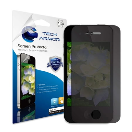 WHY BUY A TECH ARMOR 4WAY PRIVACY SCREEN PROTECTOR?DID YOU KNOW Identity theft from smartphone peeping Toms is one of the fastest growing crimesPROTECT YOUR PASSWORDS AND OTHER PERSONAL AND PRIVATE INFORMATION The Tech Armor Privacy screen protector is made to keep your information private. No matter what angle you choose to hold your phone, the screen can only be viewed from straight on.PRESERVE YOUR INVESTMENT AND MAXIMIZE YOUR RESALE VALUE The Tech Armor Privacy screen protector will pay for itself as your first line of line of defense from scratches that will reduce the resale value of your iPhone 4/4S Note: We recommend that you turn up your brightness on your display, as Privacy Screens will darken the image.If you will only accept the BEST for your iPhone 4/4S, then look no further: BEST 4Way Privacy BEST Protection from Scratches BEST Way to maximize resale value BEST Bubble free installation BEST HassleFree Lifetime WarrantyWe all depend on our smartphones and tablets more today than ever. We fill them with personal, private, and sensitive information that we wouldn't want strangers having access to. The thought of having someone else's prying eyes looking at the information displayed on our screen is simply one less thing we should have to worry about. That's why Tech Armor developed 4Way Privacy screens to keep your information for your eyes only.COMPATIBILITY: Apple iPhone 4/4S, All Carriers, All ModelsThe TECH ARMOR Privacy Screen Protector Kit Includes: One (1) Privacy Screen Protector Installation Instructions Smoothing Card Microfiber Cloth Dust Removal Tape Retail Packaging Tech Armor Lifetime Replacement Warranty