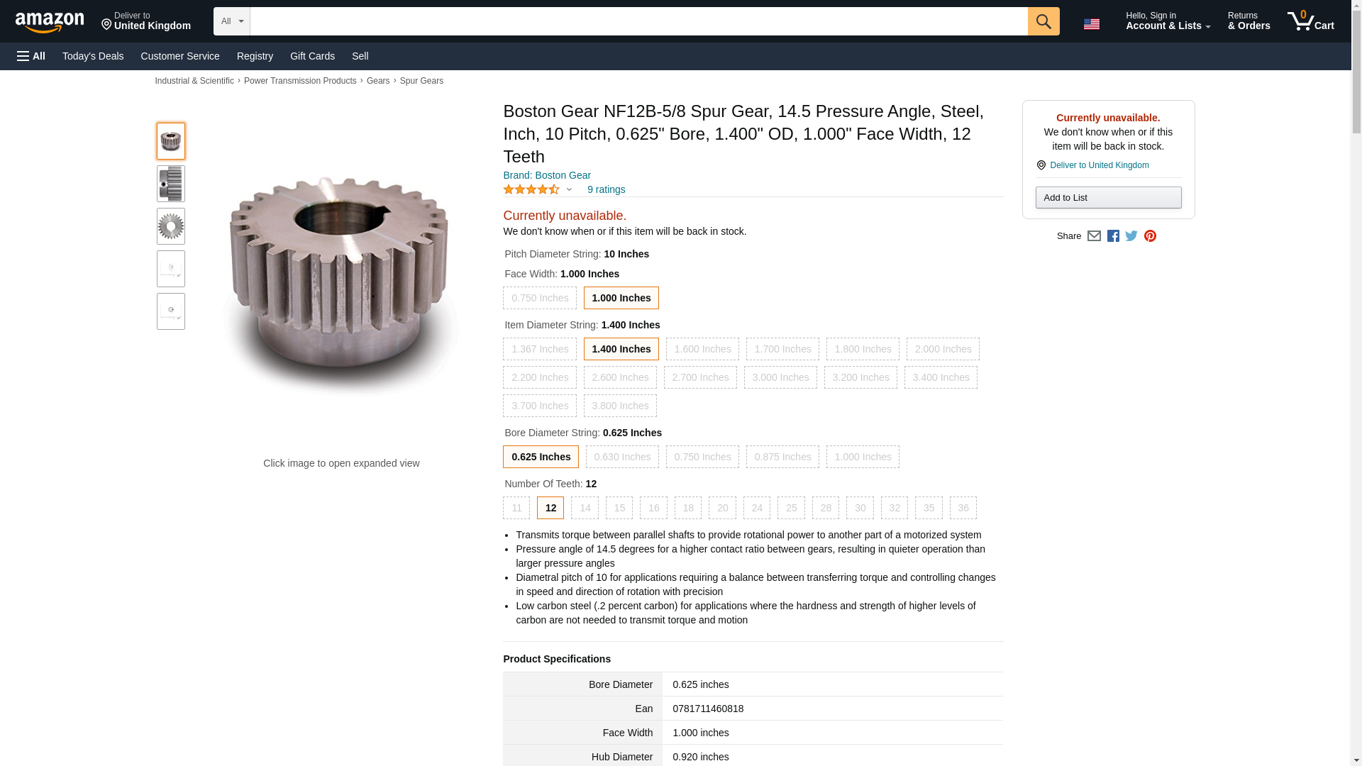 Boston Gear NF12B-5/8 Spur Gear, 14.5 Pressure Angle, Steel, Inch, 10 Pitch, 0.625" Bore, 1.400" OD, 1.000" Face Width, 12 Teeth