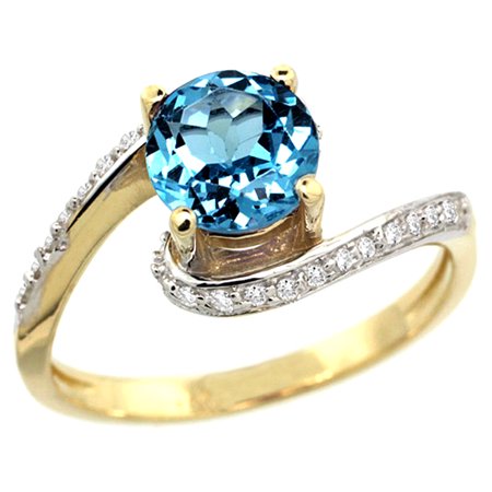 10K Yellow Gold Natural Swiss Blue Topaz Swirl Design Ring Diamond Accent Round 6mm, 1/2 inch wide