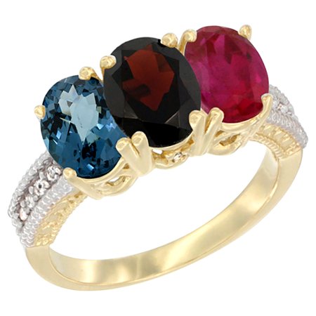 10K Yellow Gold Diamond Natural London Blue Topaz, Garnet & Ruby Ring 3-Stone Oval 7x5 mm, sizes 5 - 10