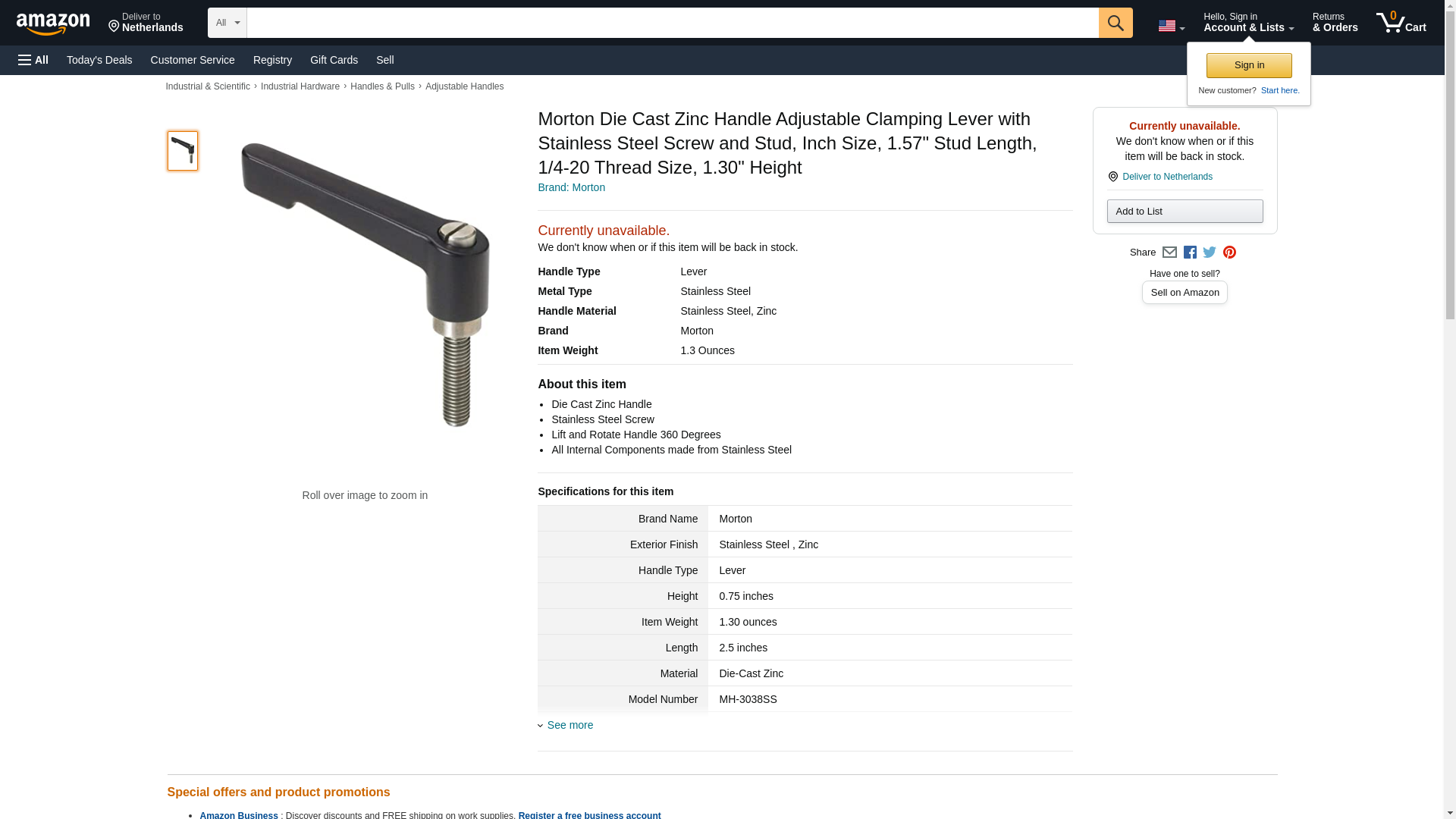 Morton Die Cast Zinc Handle Adjustable Clamping Lever with Stainless Steel Screw and Stud, Inch Size, 1.57" Stud Length, 1/4-20 Thread Size, 1.30" Height