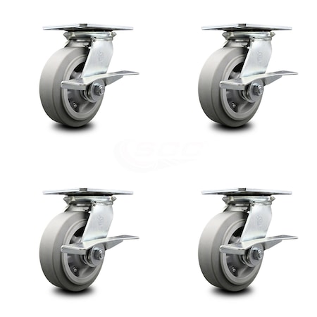 Heavy Duty Large Top Plate Thermo Rubber Flat Tread Swivel Caster Set of 4 w/6" x 2" Gray Wheels - Includes 4 Swivel w/Side Lck Brakes - 2000 lbs Total Capacity - Service Caster Brand