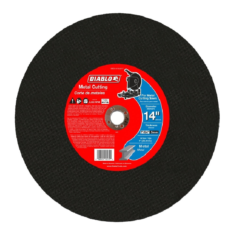Diablo 14" x 7/64" x 1" Cut-Off Saw Metal Cut-Off Wheel Premium Metal Cut-Off Wheels Provide Superior Performance and Increased Productivity Aluminum Oxide Blend Through-Cut Wheels s through material faster than other cut-off wheels and offer extra long cutting life.