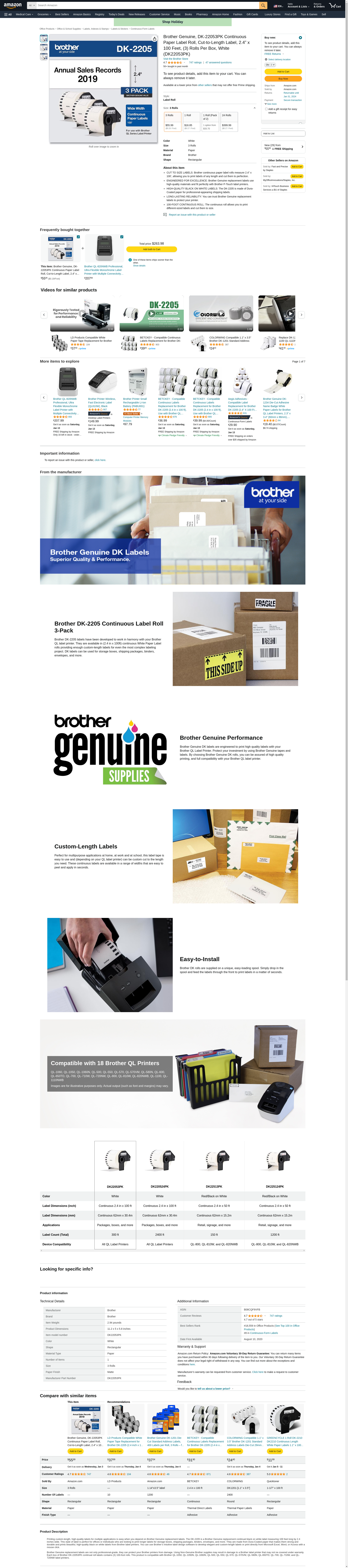 Brother Genuine, DK-22053PK Continuous Paper Label Roll, Cut-to-Length Label, 2.4” x 100 Feet, (3) Rolls Per Box, White (DK22053PK)