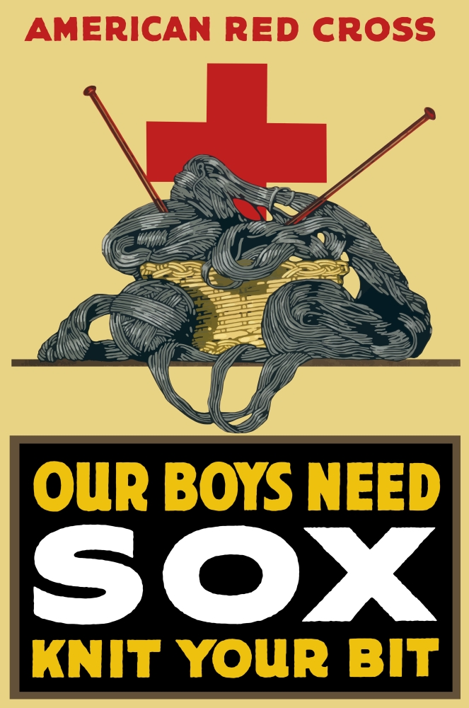 - World war one poster of a basket of yarn two knitting needles and a read cross