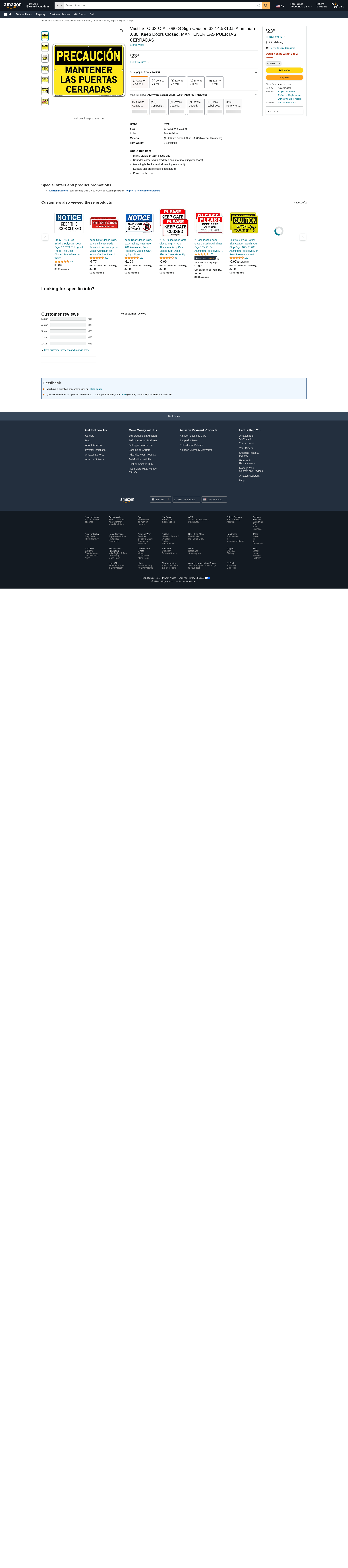 Vestil SI-C-32-C-AL-080-S Sign-Caution-32 14.5X10.5 Aluminum .080, Keep Doors Closed, MANTENER LAS PUERTAS CERRADAS