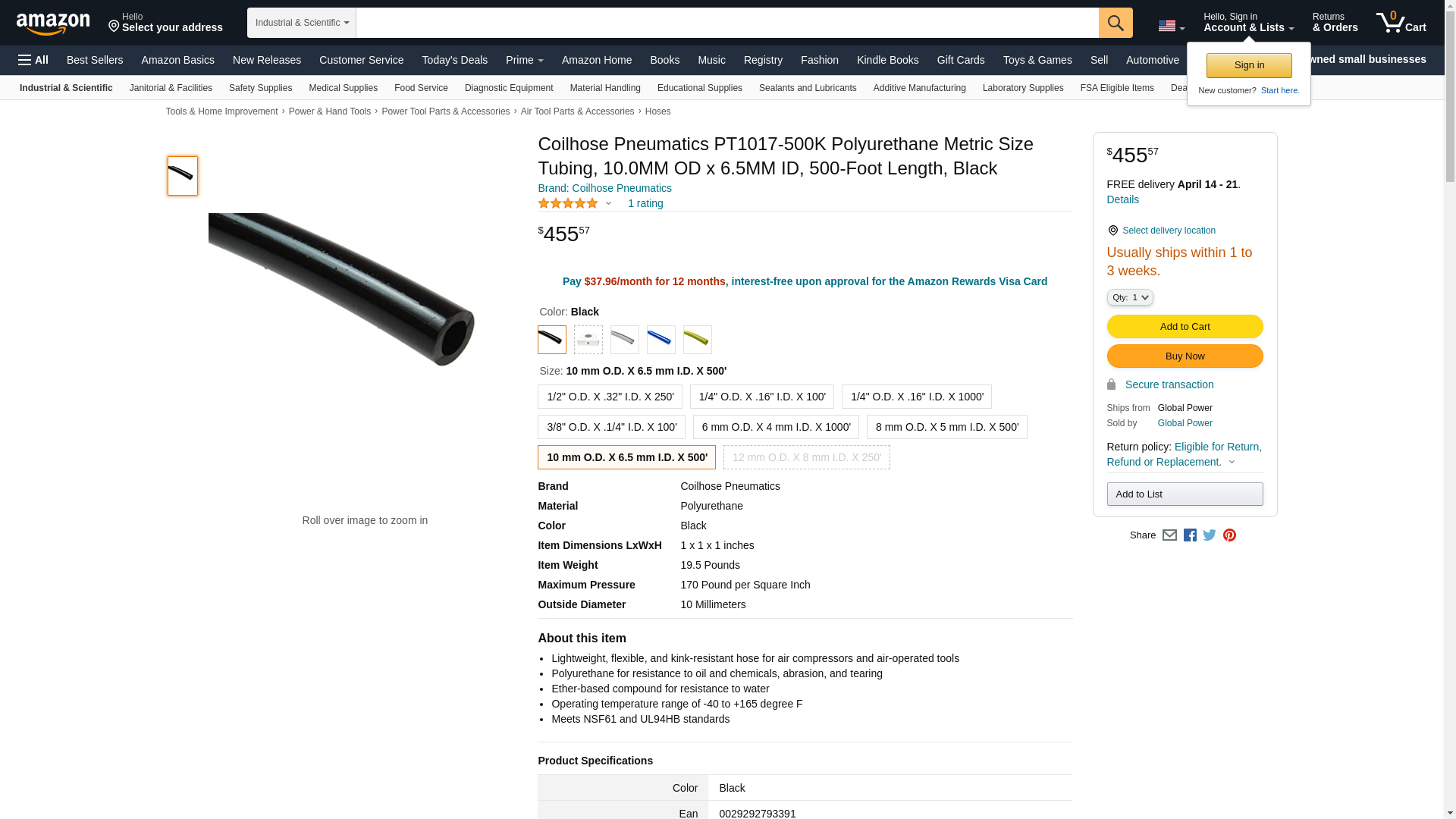 Coilhose Pneumatics PT1017-500K Polyurethane Metric Size Tubing, 10.0MM OD x 6.5MM ID, 500-Foot Length, Black
