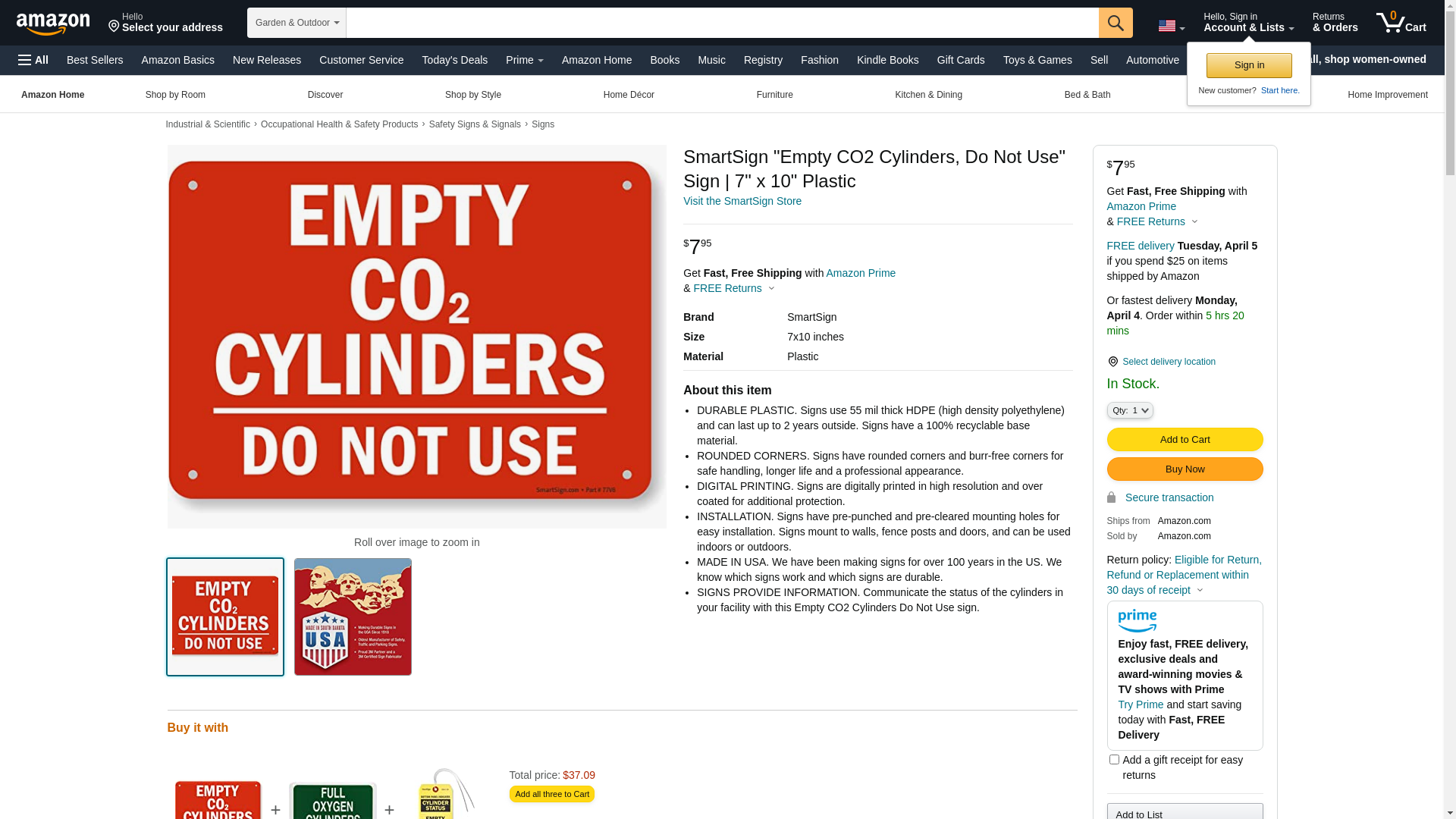 SmartSign "Empty CO2 Cylinders, Do Not Use", Plastic Sign, 7" x 10". 55 mil thick, made of polyethylene, a tear-resis...