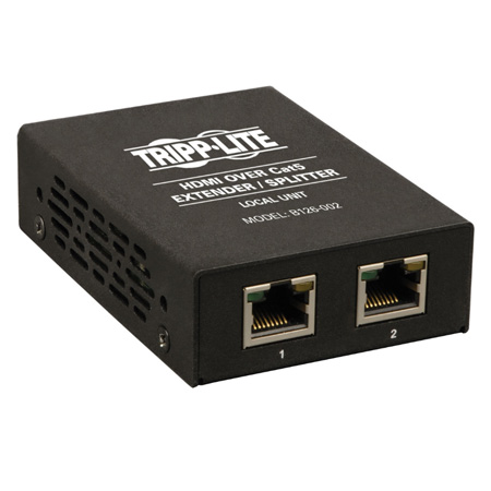 The B126-002-INT 2-Port HDMI over Cat5/Cat6 Extender/Splitter works with Tripp Lite B126-Series remote receivers to split a single HDMI audio/video signal into two separate signals. It?s ideal for digital signs, trade shows, presentations, retail settings and other applications where the video source is located farther than conventional cables allow or that require multiple displays connected to one source. It uses HDMI cable (see Tripp Lite?s P568-Series) to connect to the source and Cat5e/6 cable to transmit to the remote monitors (for best results, use 24 AWG solid-wire Cat5e/6 cable, such as Tripp Lite?s N202-Series).</p><p>When used with Tripp Lite?s B126-1A0 or B126-1A0-WP-1 active remote receivers, the Extender/Splitter can extend a 1080i (60 Hz) signal up to 200 feet (61 m), a 1080p signal (60 Hz) up to 150 feet (45.7 m) and a 3D signal up to 125 feet (38.1 m). With a B126-1P0 or B126-1P0-WP-1 passive remote receiver, it can extend a 1080i (60 Hz) signal up to 100 feet (30.5 m) and a 1080p (60 Hz) signal up to 50 feet (15.2 m). Add up to three B126-110 remote repeaters to each channel to fully extend the signal range or add more displays.</p><p>In addition to high-definition video, the B126-002-INT delivers full, rich stereo and 7.1-channel surround sound (multi-channel or PCM) audio. Easy to set up with no software or drivers to install. Mounts to a wall, rack or pole using the included hardware.</p>