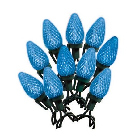 Holiday Wonderland, 25 Count, Faceted Blue Transparent, C9, LED Light Set, Green Wire, 8" Light Spacing, 6" Lead In, 6" Lead Out, 16' Lighted Length, 17' Total Length.