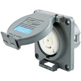 - <b>Price For:</b> Each <b>Mounting Type</b>: Flush Mount <b>Grade</b>: Industrial <b>Color</b>: Gray <b>Wiring Style</b>: Standard <b>Shrouded / Non-Shrouded</b>: Shrouded <b>NEMA Rating</b>: 4, 4X, 12 <b>Number of Wires</b>: 5 <b>Standards</b>: UL 94V-0/CSA <b>Item</b>: Watertight Locking Receptacle <b>NEMA Configuration</b>: L21-30R <b>Number of Poles</b>: 4 <b>Amps</b>: 30 <b>Voltage</b>: 120/208VAC <b>HP</b>: 3.0 <b>Special Features</b>: With Locking Cover