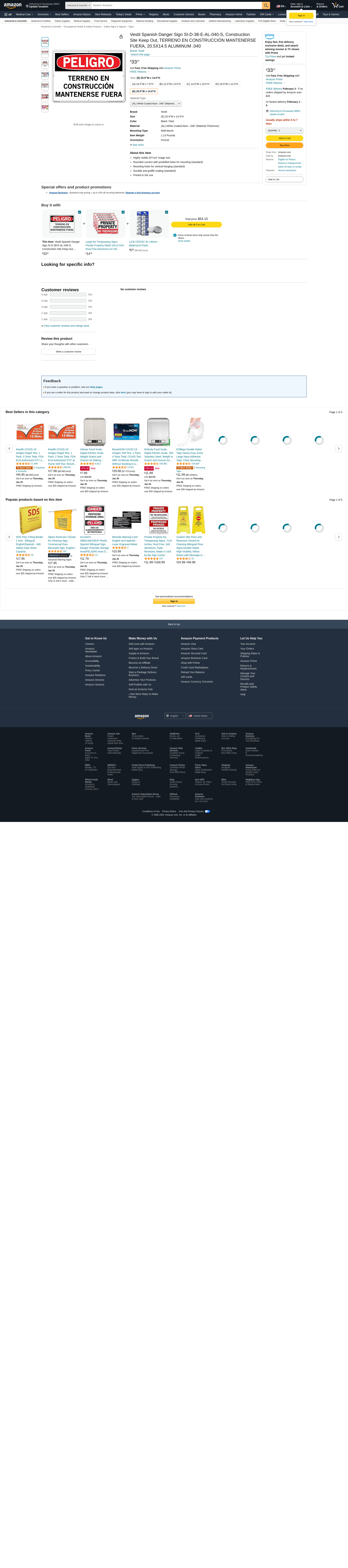 Vestil Spanish Danger Sign SI-D-38-E-AL-040-S, Construction Site Keep Out, TERRENO EN CONSTRUCCIÓN MANTENERSE FUERA, 20.5X14.5 ALUMINUM .040