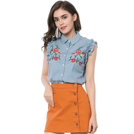 Unique Bargains Women's Floral Embroidered Ruffle Striped Button Down Shirt