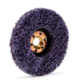 3M Scotch-Brite CX-DN deburring disc uses silicon carbide as the abrasive material and has a diameter of 4 1/2 in. Since this product is non-woven, grade is generally used to describe the abrasiveness; with the 33194 having a very coarse grade. The threaded arbor attachment allows for easy mounting to the tool or pad. All abrasive products that rotate or spin, such as the ones in this category, have a maximum speed at which you can run them. This 3M deburring disc can be run at a maximum speed of 13300 RPMs.