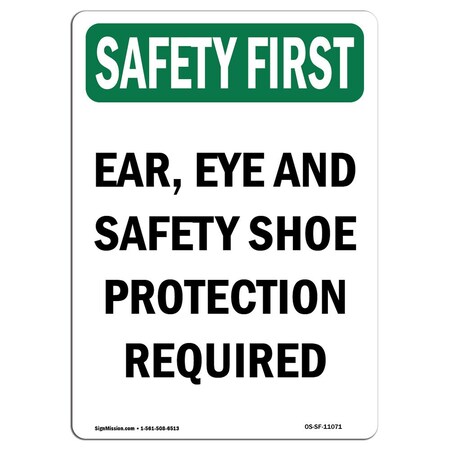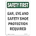 OSHA Safety First Sign - Ear, Eye and Safety Shoe Protection | Choose from: Aluminum, Rigid Plastic or Vinyl Label Decal | Protect Your Business, Work Site, Warehouse & Shop Area | Made in The USA