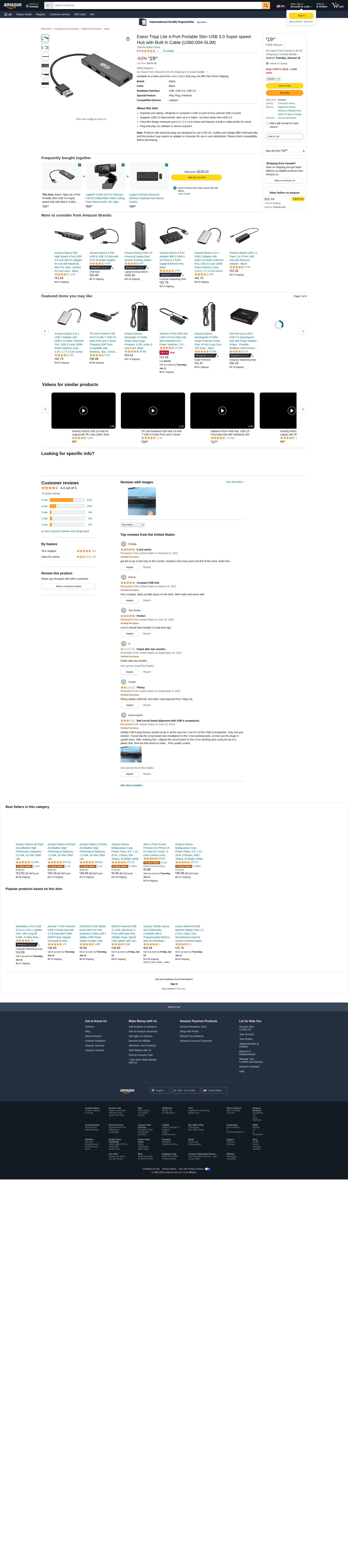 Eaton Tripp Lite 4-Port Portable Slim USB 3.0 Super speed Hub with Built In Cable (U360-004-SLIM)