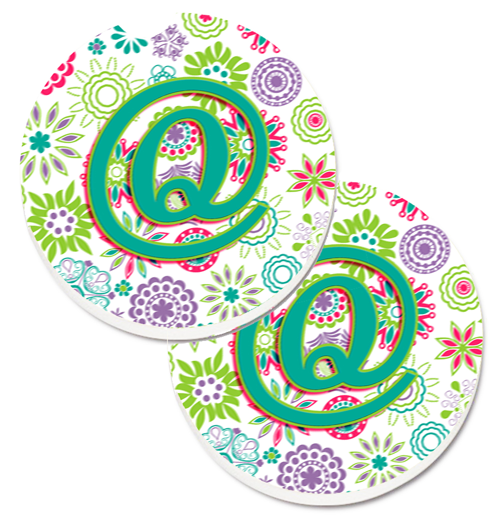 Caroline's Treasures CJ2011-QCARC Letter Q Flowers Pink Teal Green Initial Set of 2 Cup Holder Car Coasters, Large, Multicolor