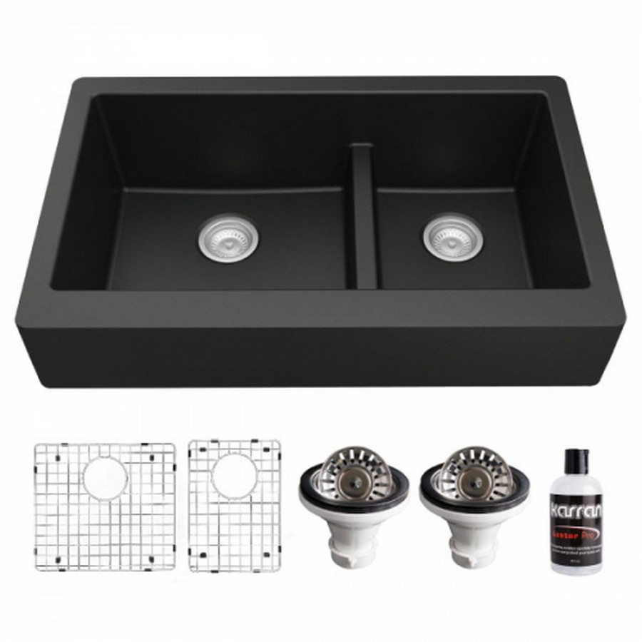 KARRAN QAR-760-BL-PK1 QUARTZ QAR 34 INCH RETROFIT FARMHOUSE OR APRON FRONT QUARTZ COMPOSITE DOUBLE OFFSET BOWL...