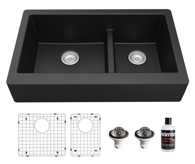 Karran QAR-760 Retrofit Farmhouse/Apron-Front Quartz Composite 34 in. Double Offset Bowl Kitchen Sink Kit in Black