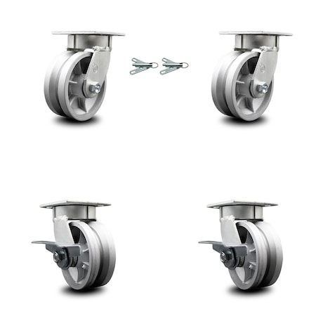 Kingpinless V Groove Semi Steel Swivel Top Plate Caster Set of 4 w/5" x 2" Silver Wheels-Includes 2 Swivel with Bolt on Swivel Locks&2 Swivel with Brakes-4400 lbs Total Capacity - Service Caster Brand