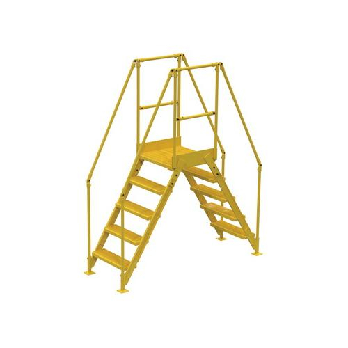 The Cross-Over Ladder mounts where you need permanent access at crossover points. The upper platform features removable two sided handrail with mid-rail and fixed toeboards to prevent objects from rolling off. Serrated steps for extra grip and safety. Ground legs include floor mounting pads. Unit must be anchored to the floor. Cross-Over Ladder is all welded steel construction but can be knocked-down for storage and shipping. Powder coat yellow finish. Limited Warranty: 90 days. Uniform Capacity (pounds): 500, Platform Height (in.): 50, Platform Width (in.): 23-1/2, Platform Length (in.): 24, Handrail Height (in.): 42-5/8, Mid-Rail (in.): 21, Toeboard (in.): 4, Step Width (in.)