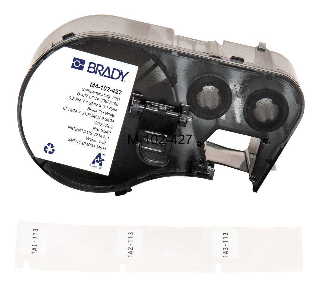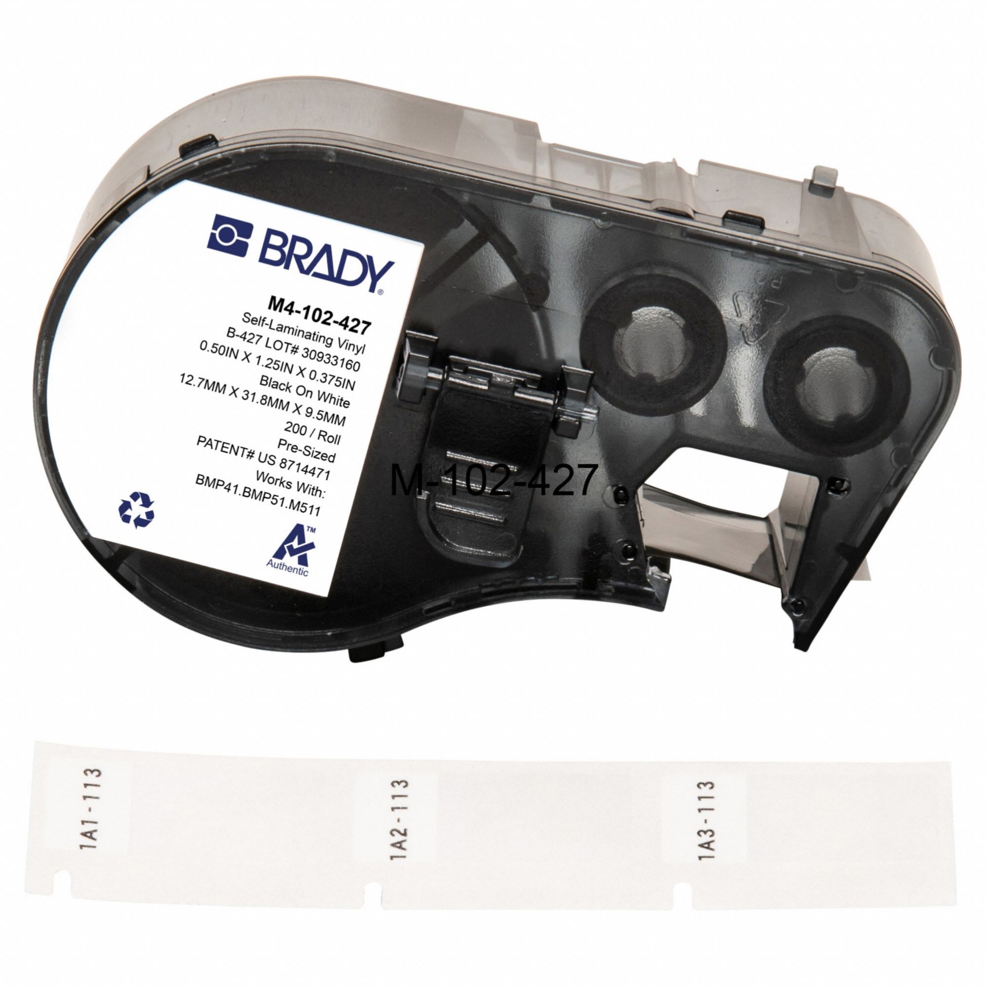 Brady Authentic (M4-102-427) Self-Laminating Vinyl Wrap Around Labels 1.25"H x 0.5"W Black on White, Clear, 200 Labels. for use with The BMP41, BMP51, and M511 Label Printers