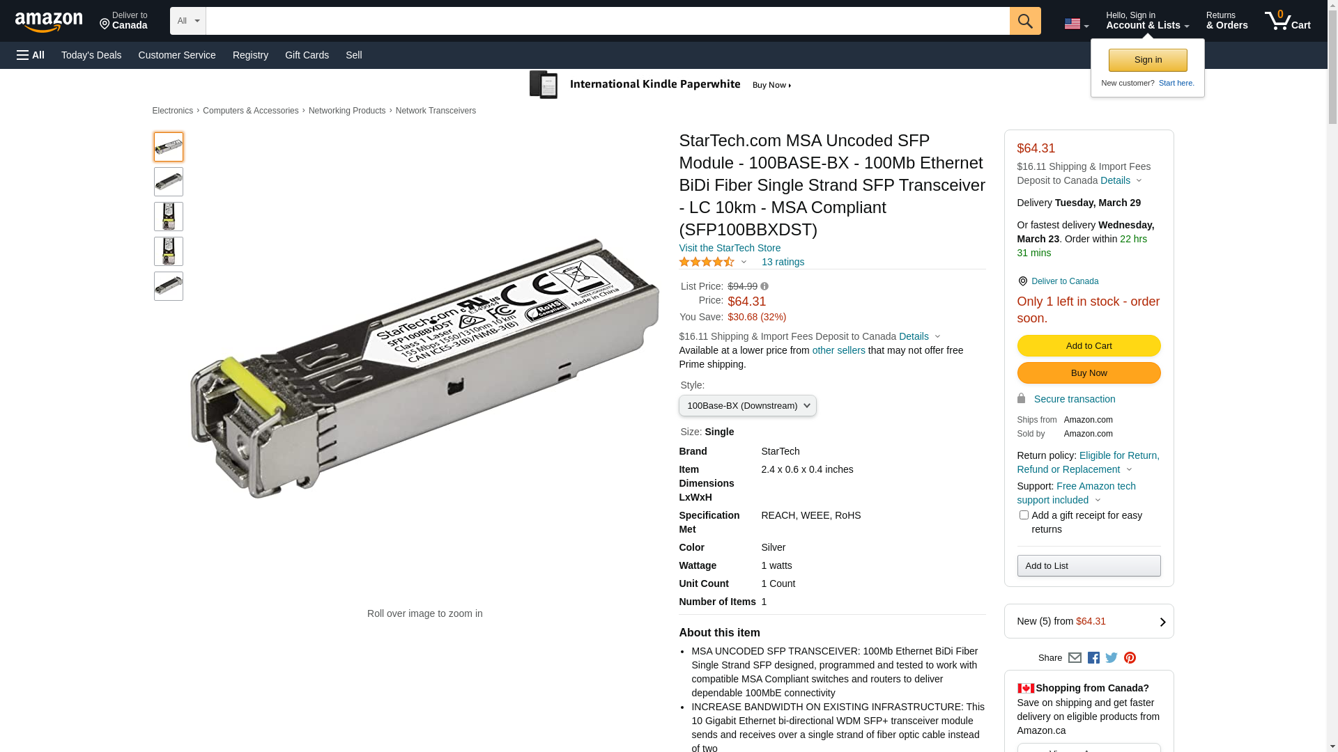 SFP100BBXDST - StarTech.com MSA Compliant 100 Mbps Fiber SFP Transceiver Module - Transceivers Direct