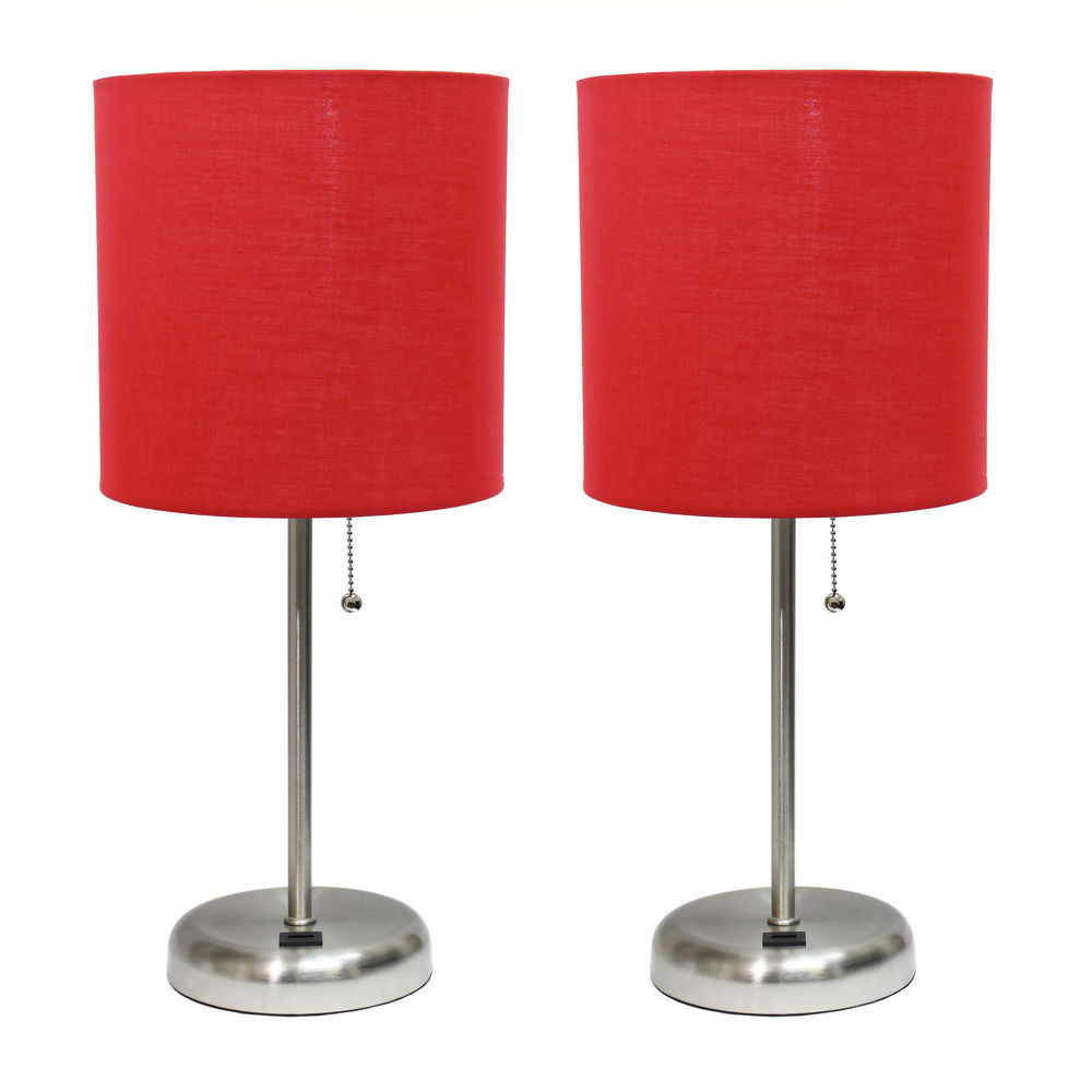 This fun and fashionable lamp features a brushed steel base and a fabric shade It comes equipped with a USB seated in the base for use to charge mobile phones handheld games tablets and other small electronics This lamp will add a fabulous flair to any room Perfect for bedrooms kids and teens college dorms nurseries or fun offices Features. Brushed Steel base with USB charging port on base. Fabric Shade. Perfect for bedrooms kids room college dorm nursery or fun office. Uses 1 x 60W type A medium base bulb. Pack of 2Specifications. Color Red. Shade Diameter 85 x Height 195. Weight 572 lbs
