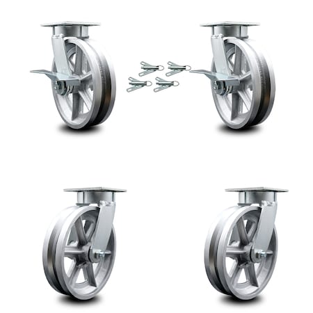 Kingpinless V Groove Semi Steel Swivel Top Plate Caster Set 4 w/8" x 2" Silver Wheels-Includes 2 Swvl w/Brakes and Bolt on Swvl Lcks&2 Swvl w/Bolt on Swvl Lcks-5000lbs Total Cpty- Service Caster Brand