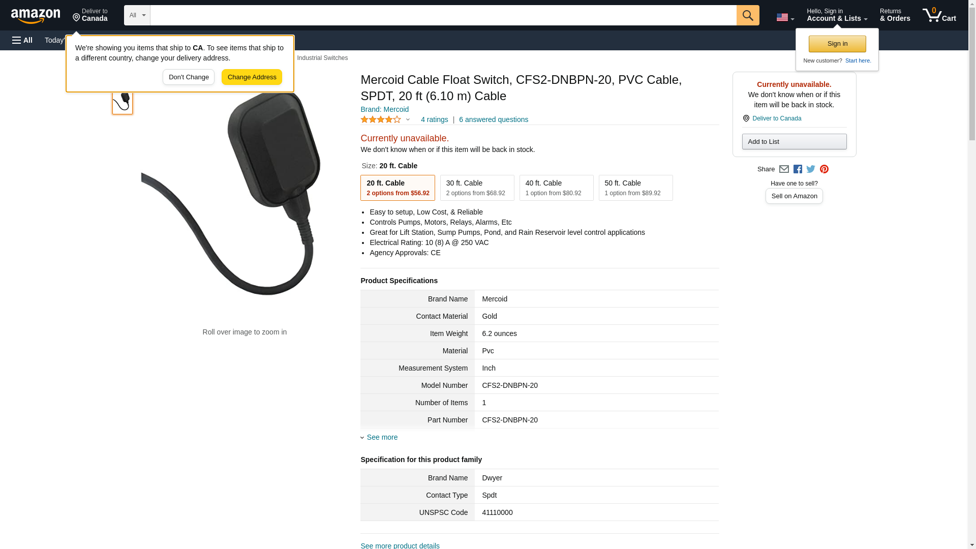 Mercoid® Cable Float Switch, CFS2-DNBPN-20, PVC Cable, SPDT, 20 ft (6.10 m) Cable