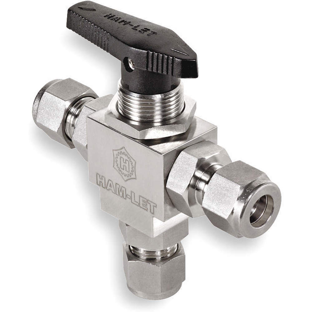 'Shut off your fear of leaks and turn on superior control with this mini ball valve from Ham-Let. This top-of-the-line mini ball valve is equipped with a 1-piece valve structure. It also has a 3-way body style and a Comp. x Comp. x Comp. connection. The ball is made of 316 Stainless Steel. Features of this mini ball valve include: panel mount/1/4 turn on/off. The handle is made of nylon material. The mini ball valve has a maximum pressure of 6000 psi CWP. It includes a standard port. It fits a tube size of 1/2. The temperature range is from -20 degrees to 280 degrees F. The body is made of 316 stainless steel material. The seat is made of PCTFE(KEL-F) material. It has a blowout proof stem made of 316 Stainless Steel. The handle type is: toggle. Standards include: SAE'