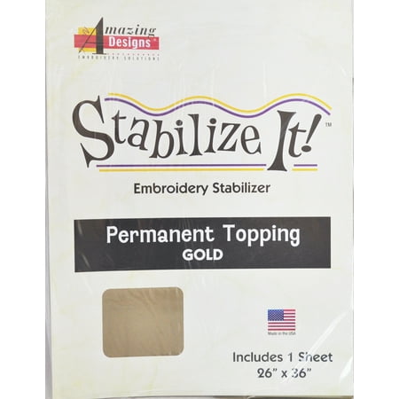 STABALIZE IT EMBROIDERY STABALIZER. PERMANENT TOPPING GOLD 1 YD. Permanent Vinyl Prevents stitches from sinking into nap of fabric Coordinates with your embroidery thread to prevent the fabric from showing through the embroidery stitches, For example: white thread on black fabric. Completely Covers Fabric, nothing shows through Excellent Stability for dense embroidery Ideal for embroidery on fabrics with nap such as:velvet, corduroy, terry cloth. ADS-PT03