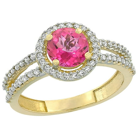 14K Yellow Gold Natural Pink Topaz Diamond Halo Ring Round 6mm, sizes 5 - 10