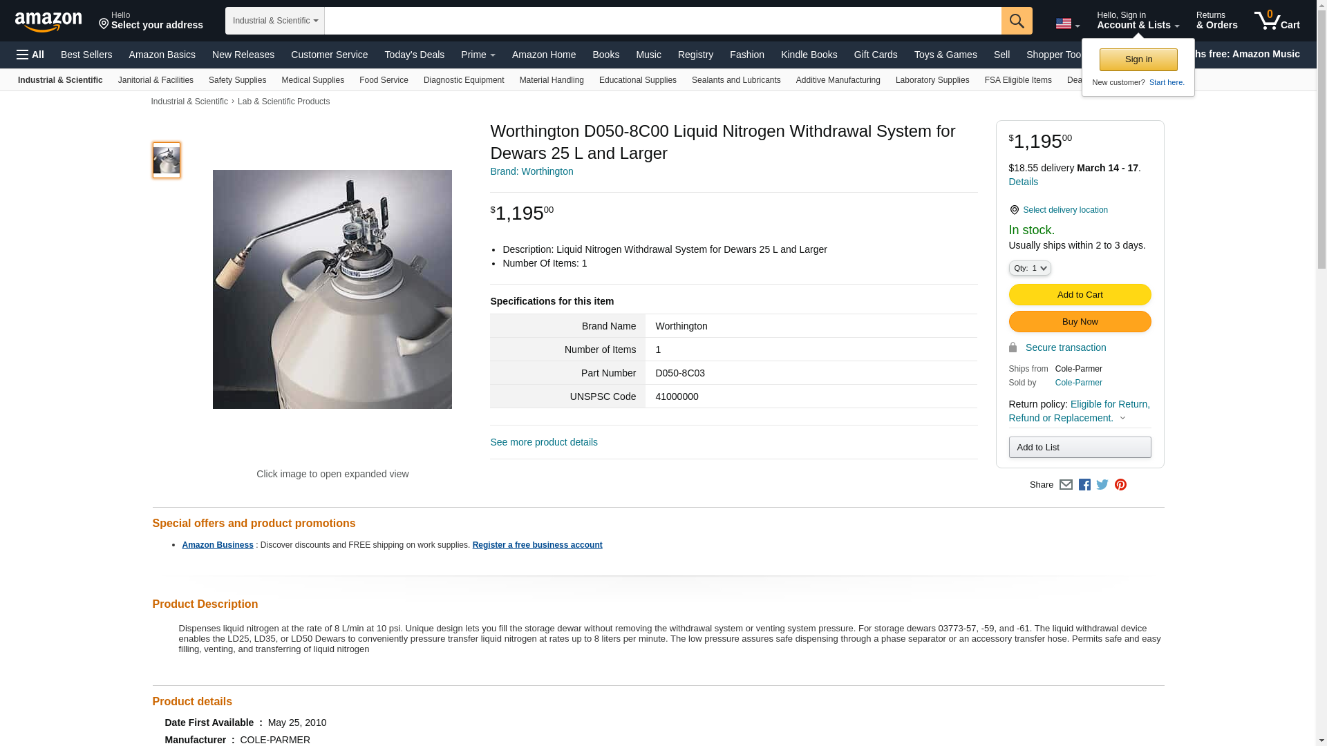 Worthington D050-8C00 Liquid Nitrogen Withdrawal System for Dewars 25 L and Larger