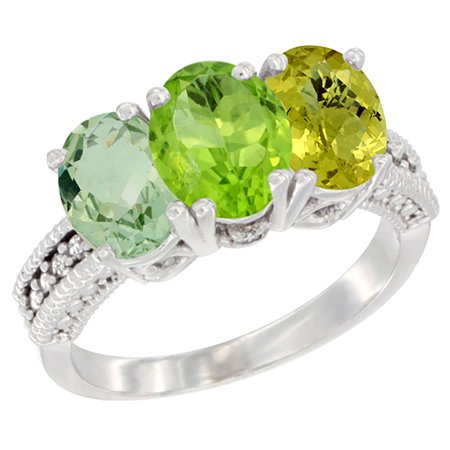 14K White Gold Natural Green Amethyst, Peridot & Lemon Quartz Ring 3-Stone 7x5 mm Oval Diamond Accent, sizes 5 - 10