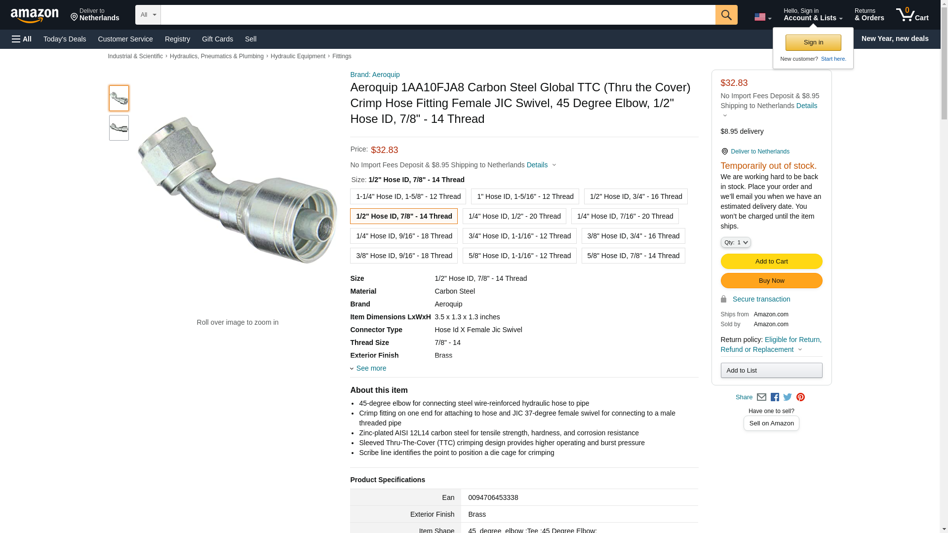 Aeroquip 1AA10FJA8 Carbon Steel Global TTC (Thru the Cover) Crimp Hose Fitting Female JIC Swivel, 45 Degree Elbow, 1/2" Hose ID, 7/8" - 14 Thread