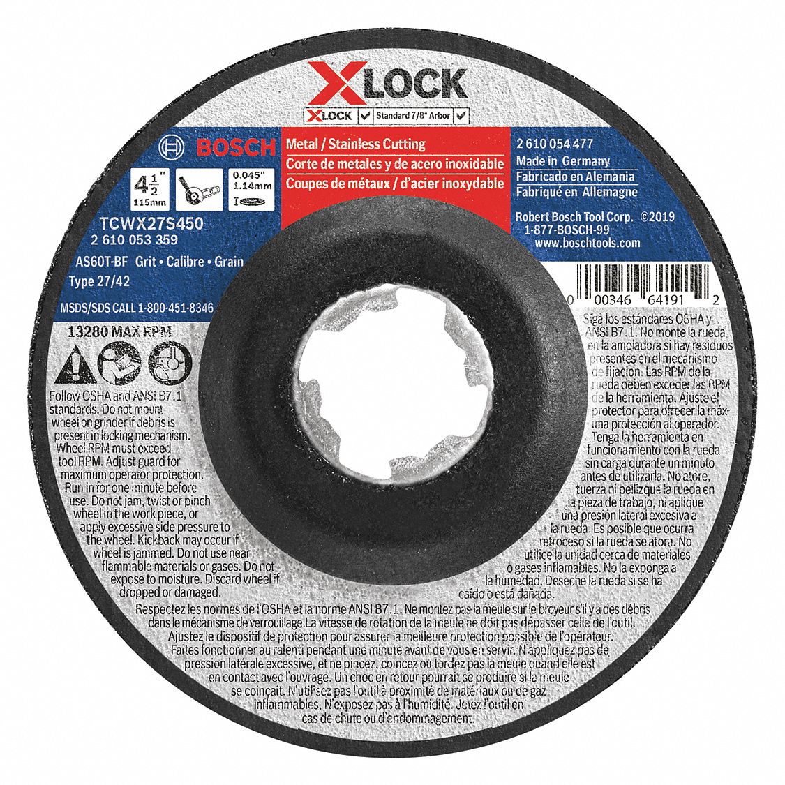 BOSCH TCWX27S450 4-1/2 In. x .045 In. X-LOCK Metal/Stainless Fast Cutting Abrasive Wheel 60 Grit Compatible with 7/8 In. Arbor Type 27A (ISO 42) for Applications in Metal, Stainless Steel Cutting