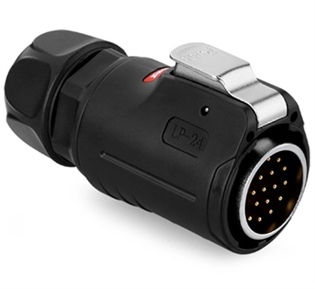 Cnlinko LP-24-C19PE-01-001 is a 19 pin M24 male cable plug for power applications. Accommodates 26-24 AWG cable. Rated for 250V and 5 A.