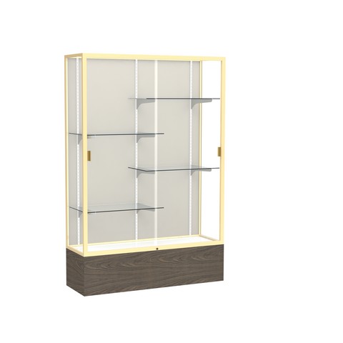 2074PB-GD-WV Backing: Plaque Fabric, Vinyl Finish: Walnut, Frame Finish: Gold Features: -Sliding tempered glass doors for safety and easy access to contents. -Built in lock for security. -Anodized aluminum framing. -Adjustable levelers for stability on uneven floors. -Wood grain vinyl base. -Reflective mirror back adds luster and class. Product Type: -Trophy display case. Style: -Floor standing. Display Material: -Glass. Country of Manufacture: -United States. Frame Material: -Metal. Adjustable Shelves: -Yes. Dimensions: Overall Height - Top to Bottom: -72". Overall Width - Side to Side: -48". Overall Depth - Front to Back: -16". Overall Product Weight: -279 lbs.