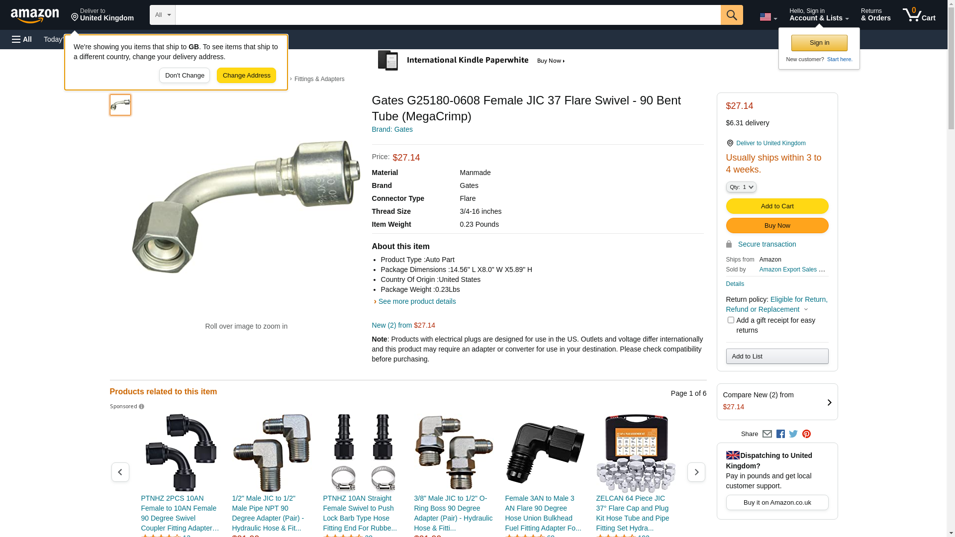 | Feature | Gates G25180-0608 Female JIC 37\xb0 Flare Swivel - 90\xb0 Bent Tube |