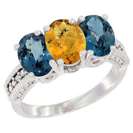 10K White Gold Natural Whisky Quartz & London Blue Topaz Sides Ring 3-Stone Oval 7x5 mm Diamond Accent, sizes 5 - 10