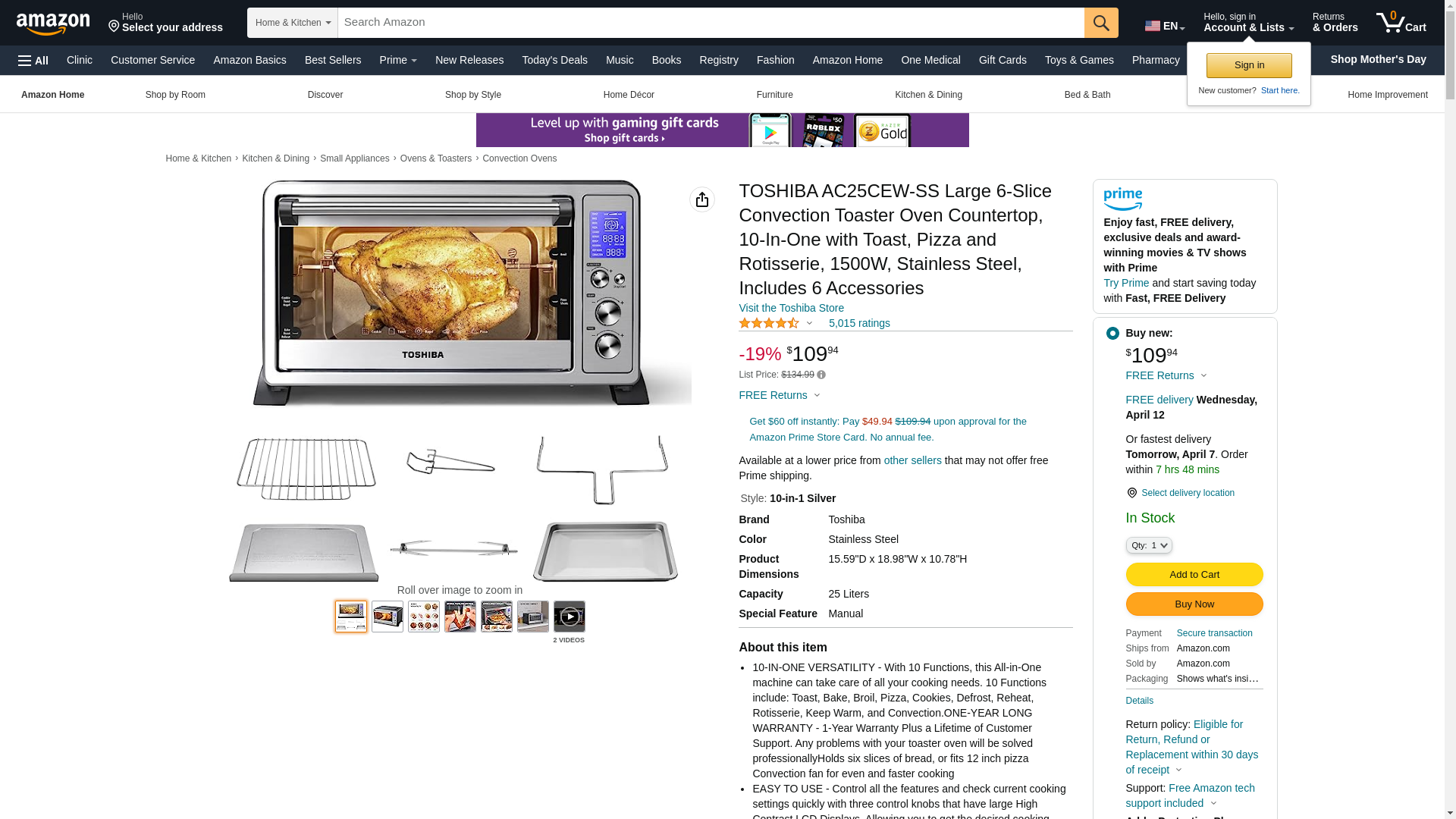 TOSHIBA AC25CEW-SS Large 6-Slice Convection Toaster Oven Countertop, 10-In-One with Toast, Pizza and Rotisserie, 1500W, Stainless Steel, Includes 6 Accessories