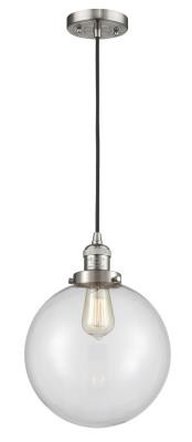 The X-Large Beacon 1 Light Mini Pendant is part of the Franklin Restoration Collection. Includes 10 Feet Black Textured Cord - Franklin Restoration Brushed Satin Nickel 10-Inch One-Light Pendant with Clear Beacon Shade and Black Textured Cord - 10 Feet Of Black Textured Cord - Bulb Tint: Amber - 10 x 9.75 Inches, Clear Beacon Globe Shaped Glass Shade - 4.5 Inches 2mm Heavy Cast Canopy - Fitter: 3.25-Inch - Limited Manufacturer Warranty: 2 Years for Finish and Lifetime for Electrical - Solid Brass 90 Degree Hang Straight Swivel for Sloped Ceilings Included - Rated for 100 Watt Maximum - In order to maintain the finish we recommend simply using water and a cheesecloth towel - Compatible with Incandescent, LED, Fluorescent and Halogen bulbs