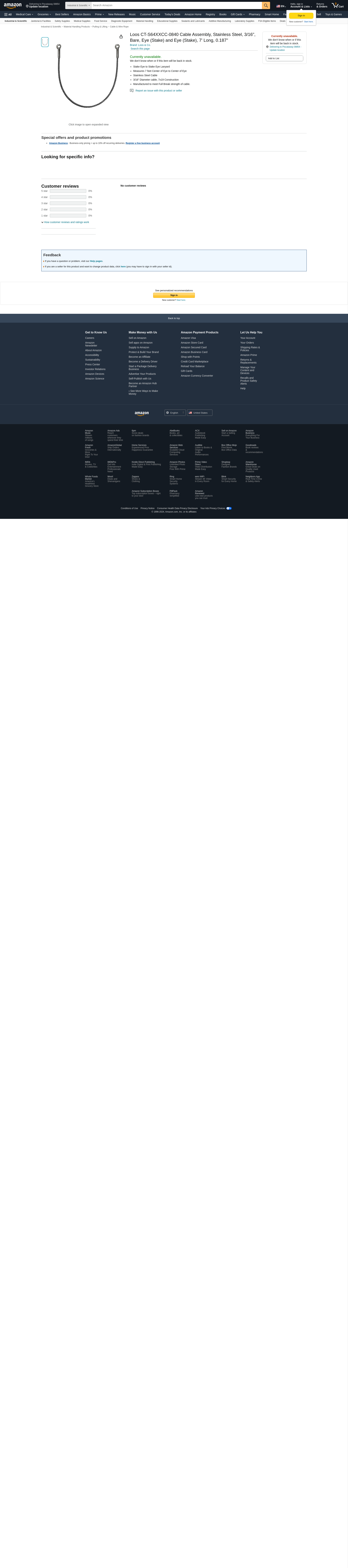 Loos CT-S64XXCC-0840 Cable Assembly, Stainless Steel, 3/16", Bare, Eye (Stake) and Eye (Stake), 7' Long, 0.187"