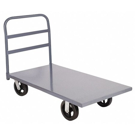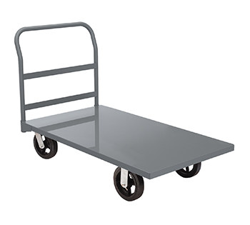 This steel platform truck features a strong, smooth 13 gauge Steel deck that is longitudinal steel reinforced. Features 36in high, 1in diameter removable steel handle has three horizontal braces for rigidity and to keep the material from sliding off the truck. Equipped with 2 swivel and 2 rigid casters. Available in gray baked enamel finish. MPN - R2168MRB3048