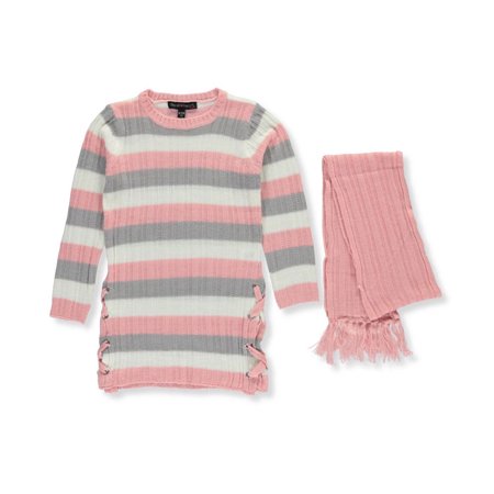 Comfort and glamour team up for this Derek Heart sweater dress and scarf set. <ul> <li>Derek Heart sweater dress with scarf</li> <li>Acrylic rib-knit sweater with striping and corset-style lacing on sides (100% acrylic)</li> <li>Acrylic rib-knit scarf with fringe trim (100% acrylic)</li> <li>Machine wash cold</li> <li>Imported</li> </ul>