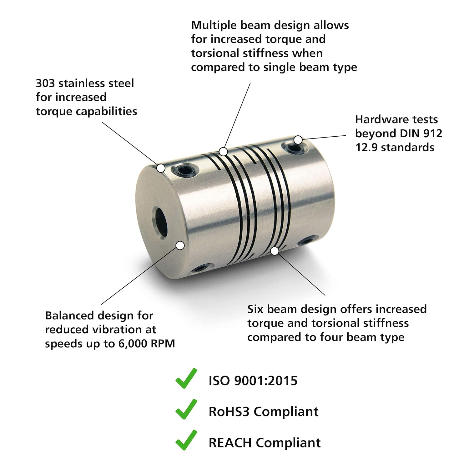 - Four beam coupling for use in angular, parallel, and axial misalignment scenarios requiring zero backlash and torsional stiffness